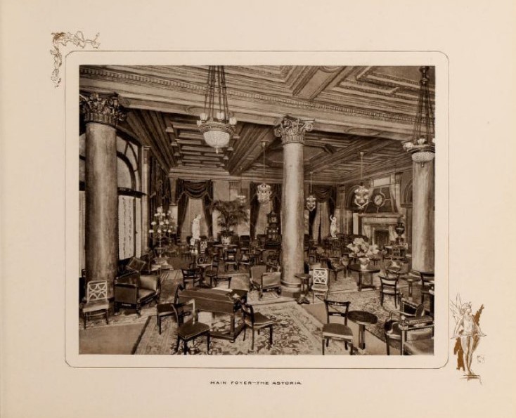 - Boldt George, [Falk Benjamin J. (phot.)]. « Main foyer- The Astoria » in The Waldorf-Astoria, New York. 1903. BVL. Fonds Oscar Michel Tschirky.