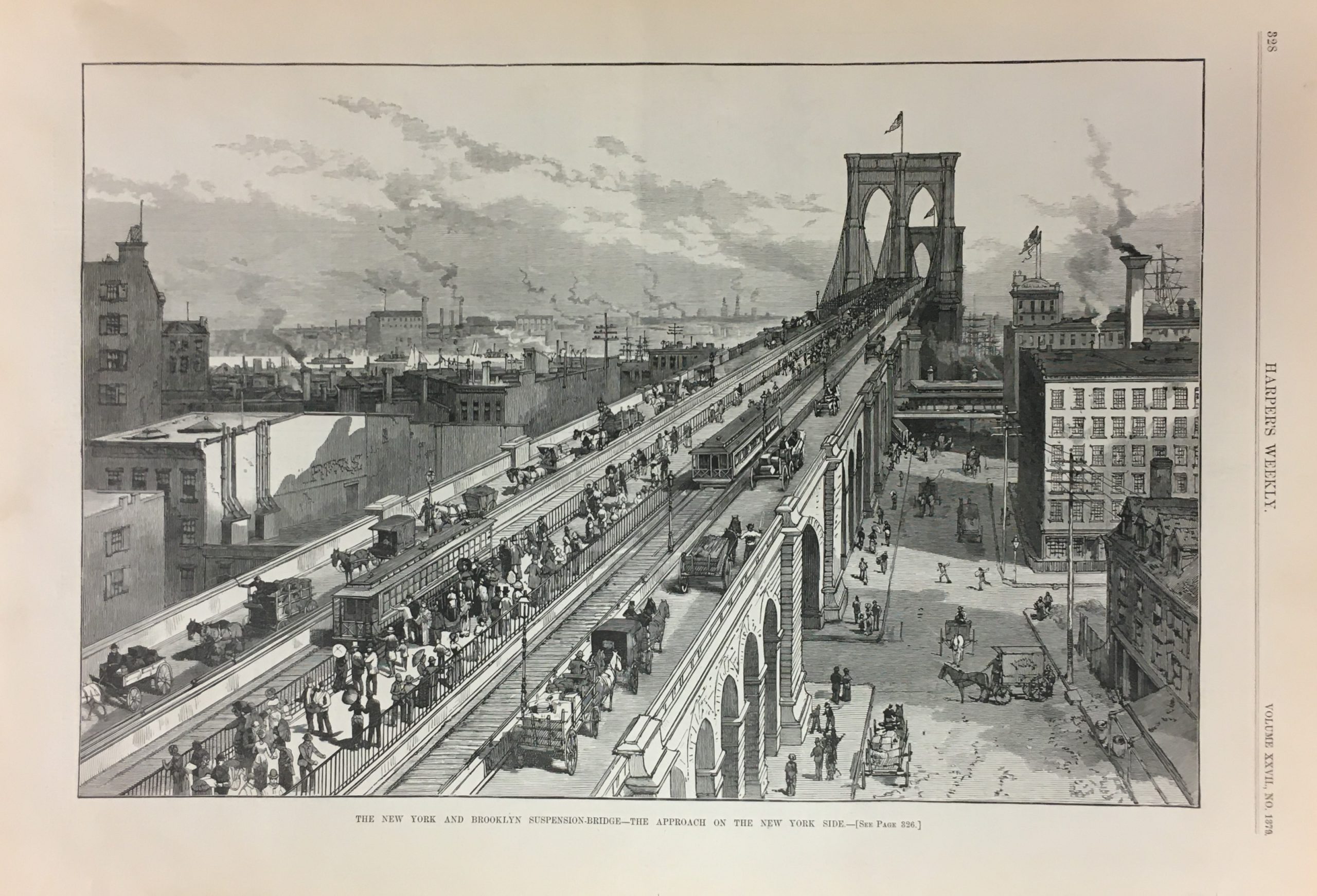 - Anonyme (ill.). « The New York and suspension bridge – The approach on the New York side » in Harper’s weekly, le 26 mai 1883. vol. XXVII, no. 1879, p. 328. BVL. Fonds Oscar Michel Tschirky.